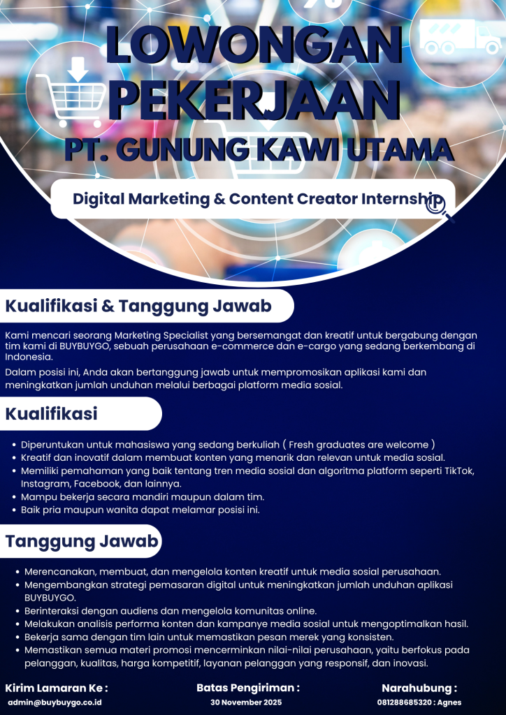 Saatnya kamu bergabung dengan PT Gunung Kawi Utama (BUYBUYGO) sebagai Digital Marketing & Content Creator Intern!