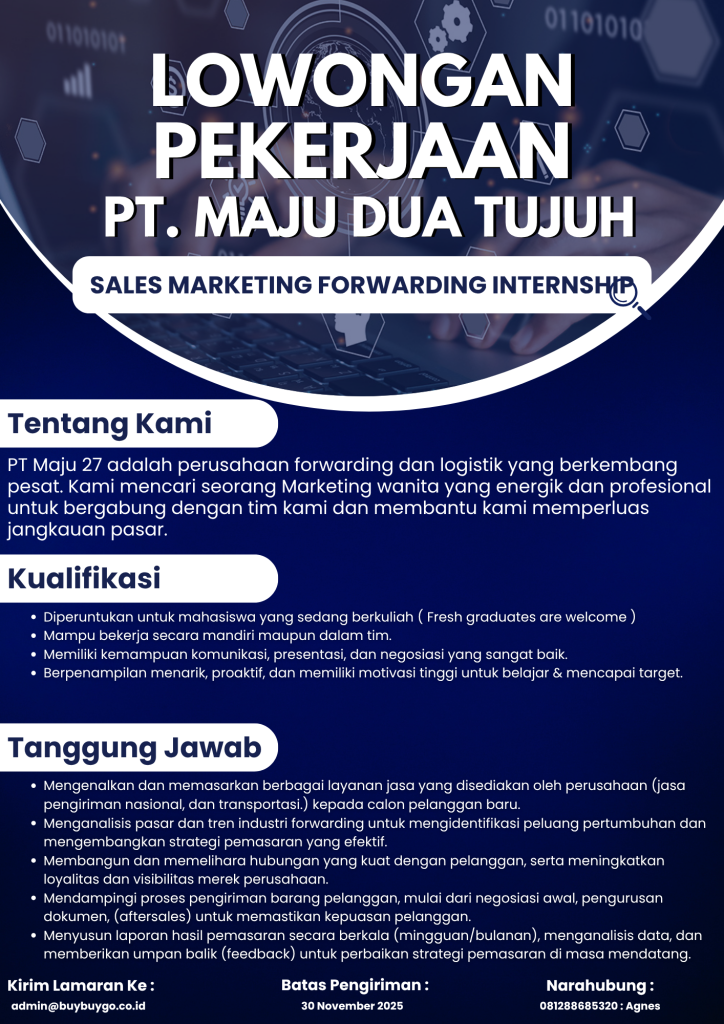 Kami mencari mahasiswa atau fresh graduate wanita yang energik, komunikatif, dan proaktif untuk posisi Sales Marketing Forwarding Intern.