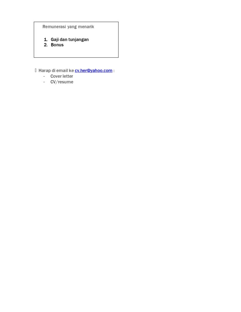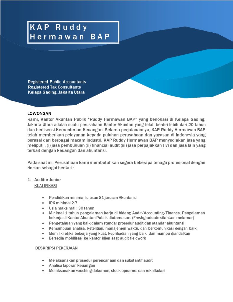 KAP Ruddy Hermawan BAP, Kantor Akuntan Publik yang berlokasi di Kelapa Gading, Jakarta Utara, membuka kesempatan bagi profesional muda untuk bergabung dan mengembangkan karier di bidang audit, akuntansi, dan perpajakan. Kami telah berpengalaman lebih dari 20 tahun dalam memberikan layanan keuangan kepada berbagai perusahaan dari beragam industri di Indonesia. Jika Anda memiliki dedikasi tinggi dan siap berkembang bersama tim profesional, segera kirimkan lamaran dan CV Anda ke cv.her@yahoo.com.