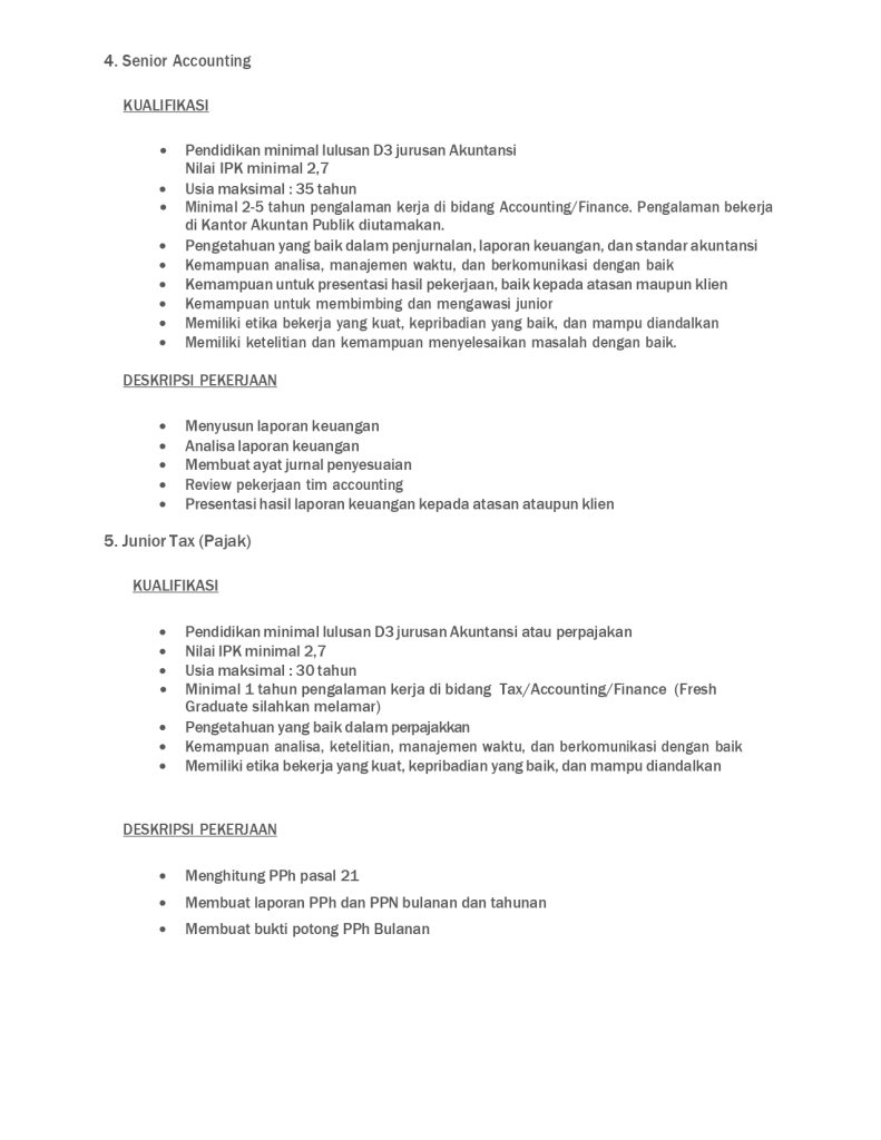 KAP Ruddy Hermawan BAP, Kantor Akuntan Publik yang berlokasi di Kelapa Gading, Jakarta Utara, membuka kesempatan bagi profesional muda untuk bergabung dan mengembangkan karier di bidang audit, akuntansi, dan perpajakan. Kami telah berpengalaman lebih dari 20 tahun dalam memberikan layanan keuangan kepada berbagai perusahaan dari beragam industri di Indonesia. Jika Anda memiliki dedikasi tinggi dan siap berkembang bersama tim profesional, segera kirimkan lamaran dan CV Anda ke cv.her@yahoo.com.