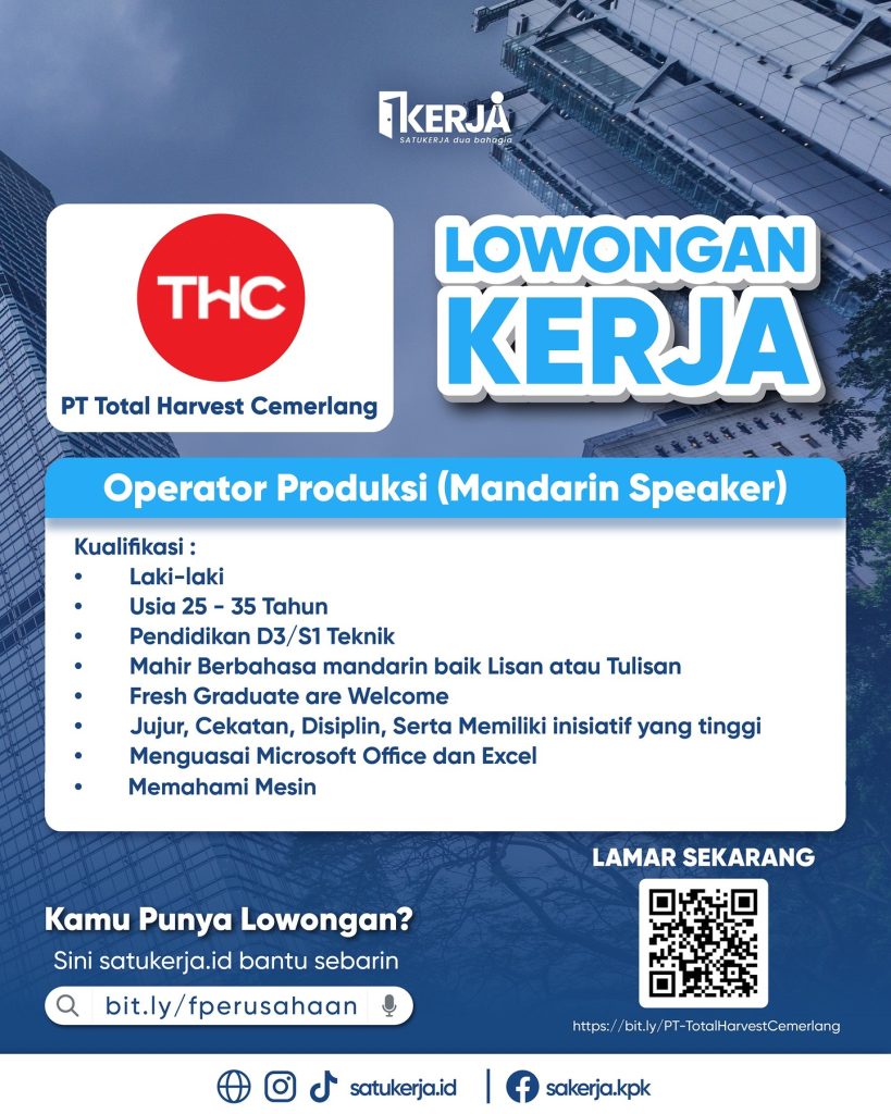 PT Total Harvest Cemerlang sedang mencari kandidat potensial untuk bergabung sebagai Operator Produksi (Mandarin Speaker),