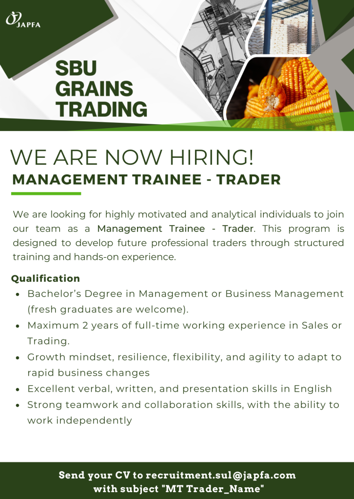 #JAPFA #Hiring #ManagementTrainee #MTTrader #GrainsTrading #LowonganKerja #CareerOpportunity #FreshGraduateJob