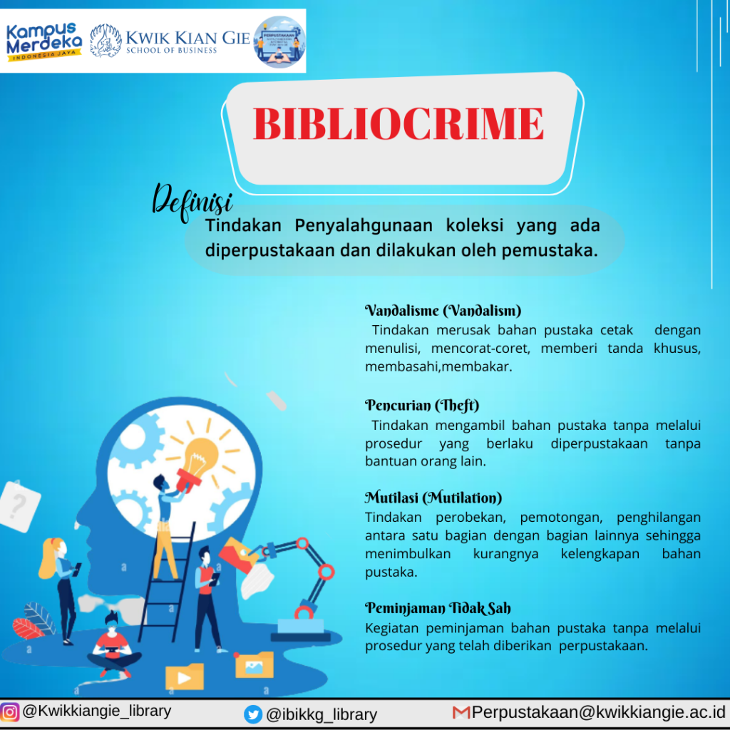 BIBLIOCRIME Apa sih istilah Bibliocrime itu ? Bibliocrime merupakan tindakan penyalahgunaan koleksi yang ada diperpustakaan dan dilakukan oleh pemustaka. Beberapa Istilah Bibliocrime yaitu 1. Vandalisme (Vandalism) merupakan tindakan merusak bahan pustaka cetak dengan menulisi, mencorat-coret, memberi tanda khusus, membasahi, membakar. 2. Pencurian (Theft) tindakan mengambil bahan pustaka tanpa melalui prosedur yang berlaku diperpustakaan tanpa bantuan…